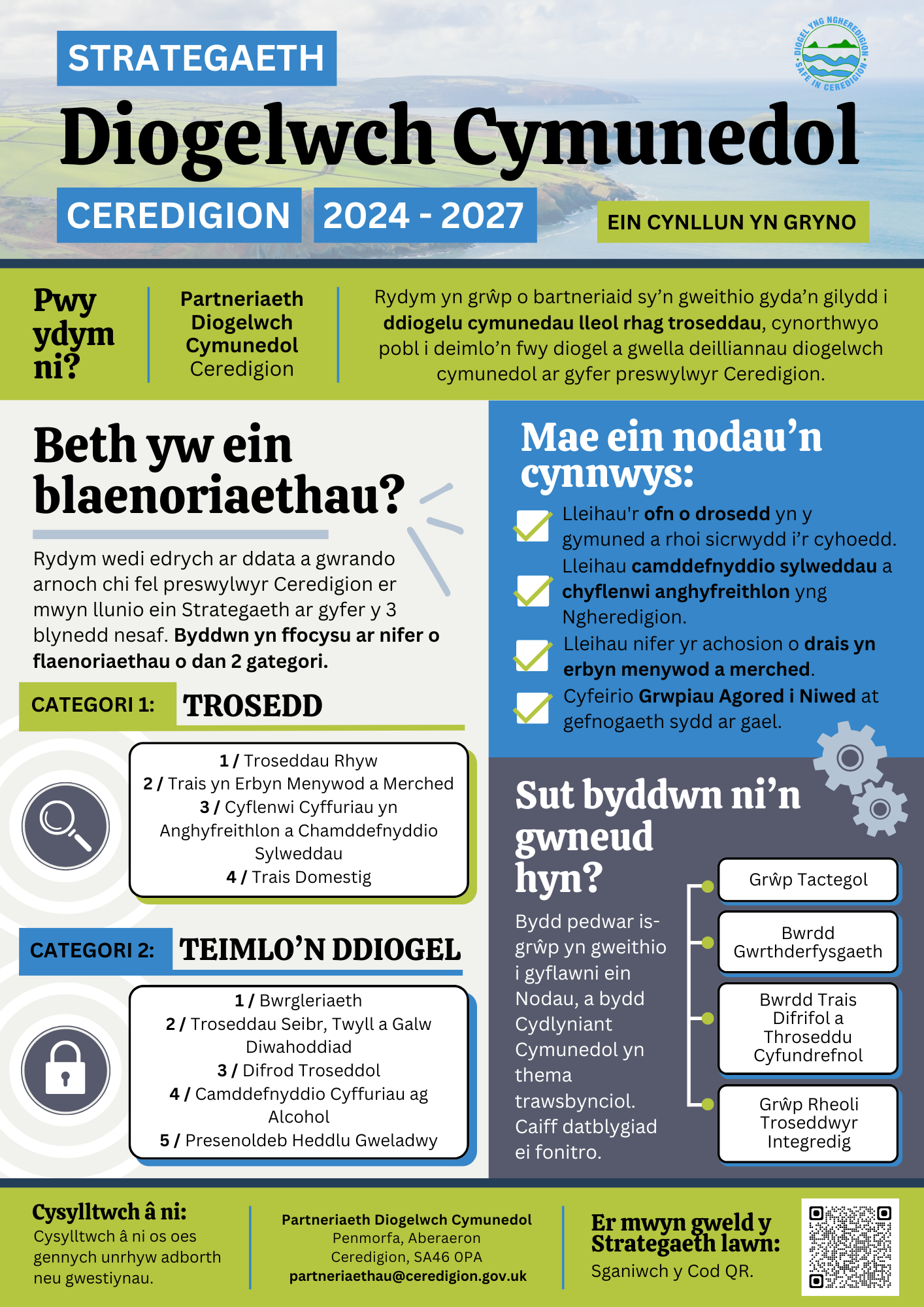 Gellir gweld Strategaeth Diogelwch Cymunedol Ceredigion ar gyfer 2024-2027, yn ogystal â'r Cynllun yn Gryno, o dan yr adran Lawrlwythiadau ar y dudalen hon.