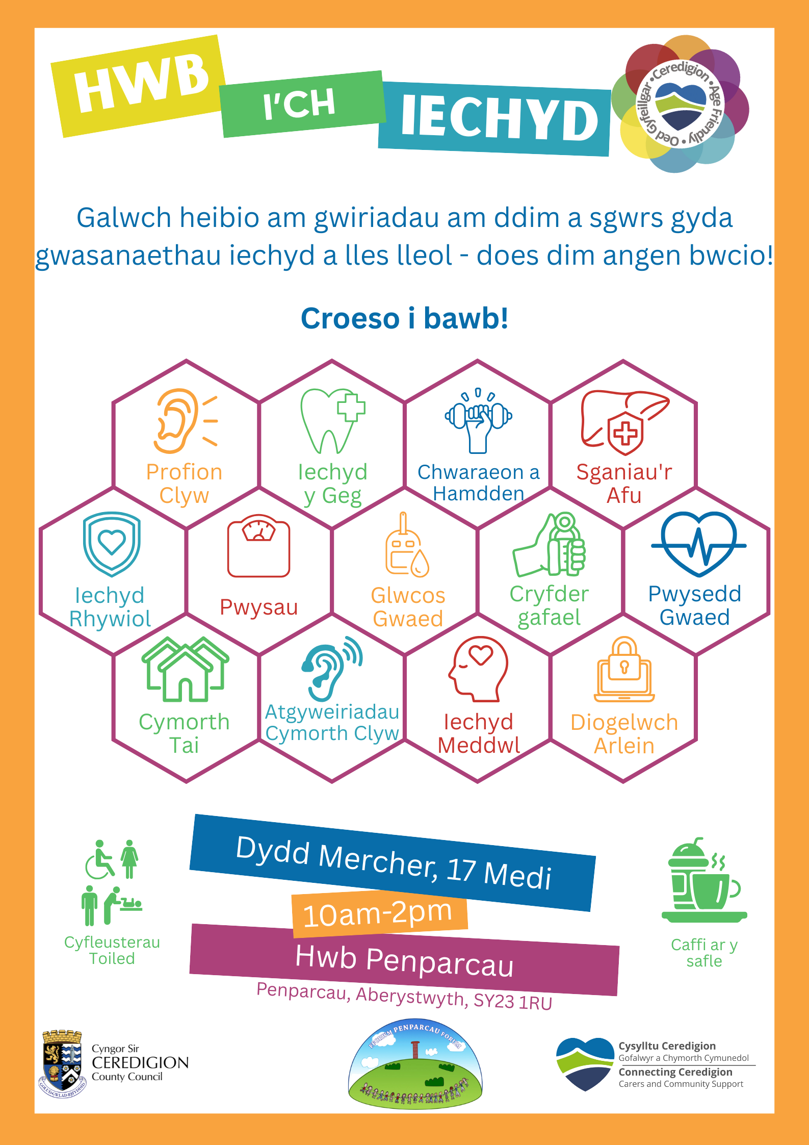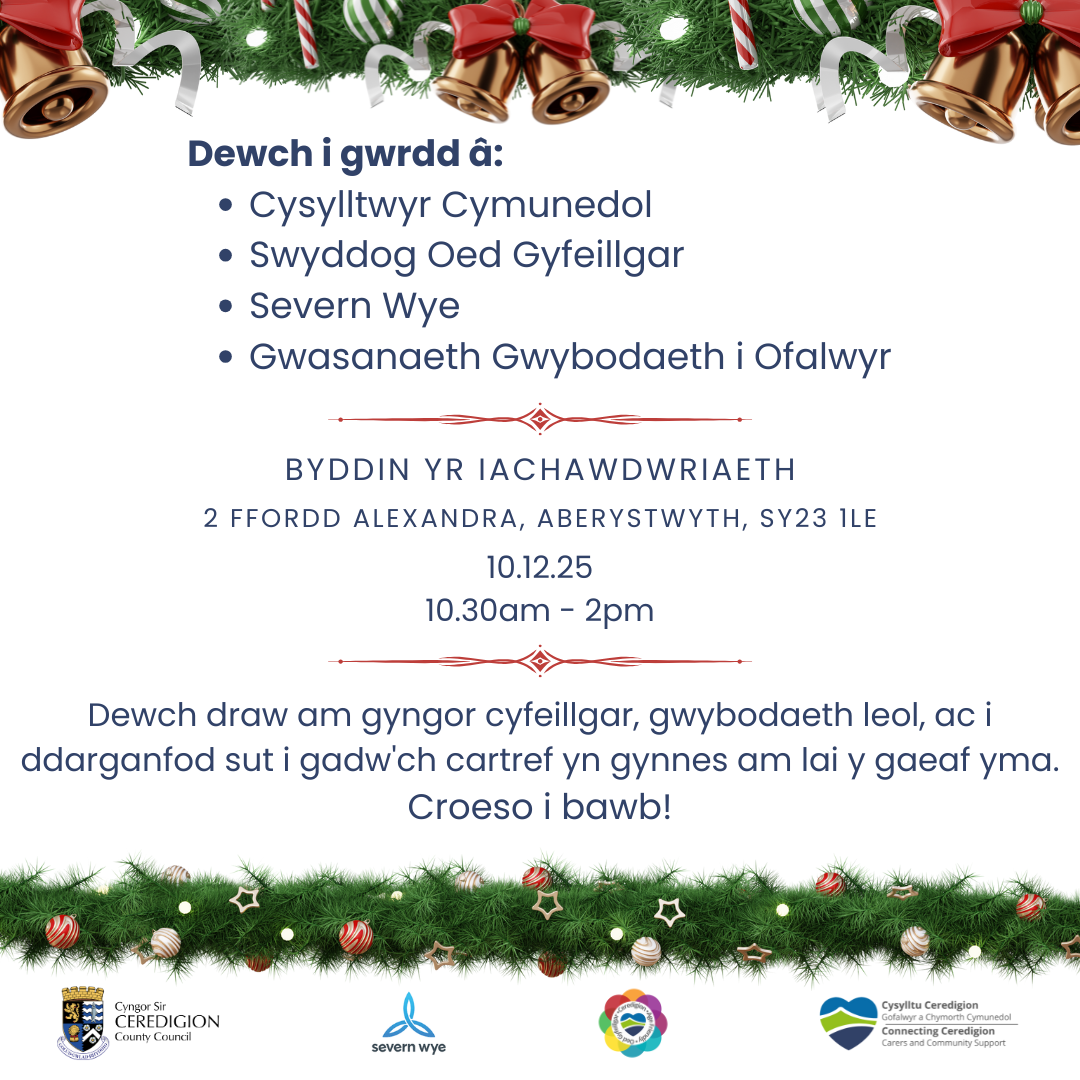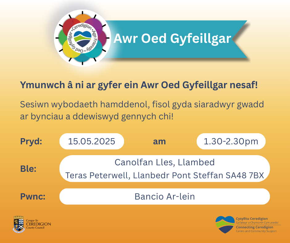 Cyfle i gwrdd â’r Cysylltwyr Cymunedol, Swyddog Ceredigion Oed Gyfeillgar, Severn Wye, a’r Gwasanaeth Gwybodaeth i Ofalwyr.
