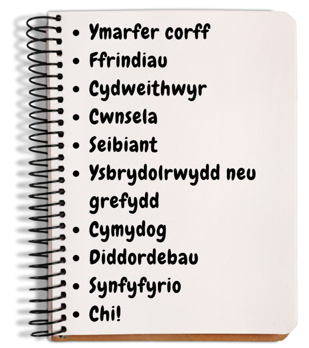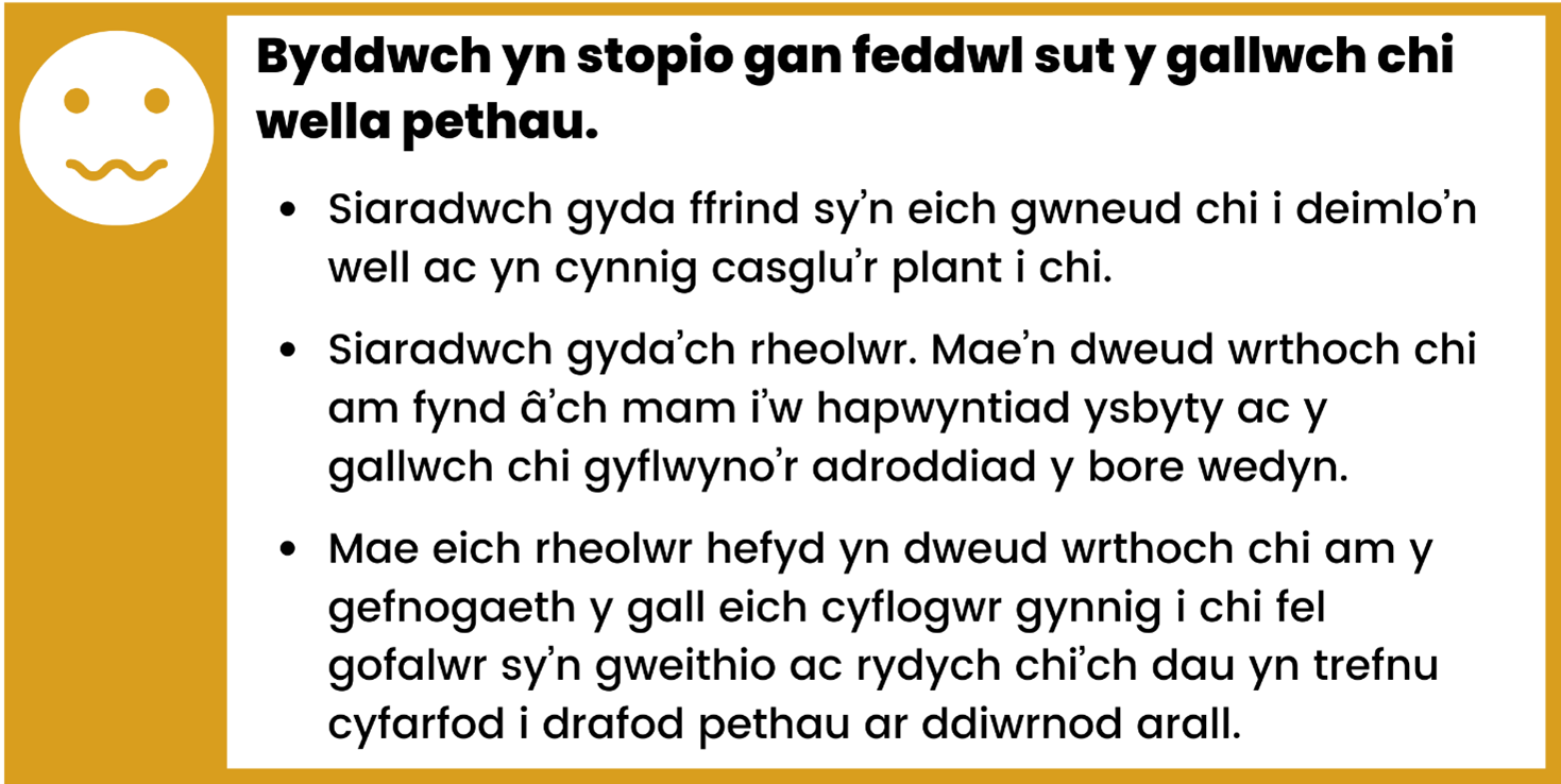Mae lle yn eich cofnod personol i roi cynnig ar hyn (tudalennau 9 i 12), neu gallech ddefnyddio papur a phen ysgrifennu neu hyd yn oed ddyfais symudol, os oes un gennych chi.