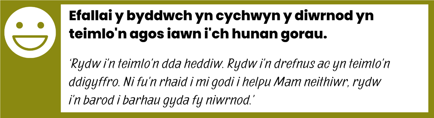 - Ystyried effaith straen arnoch chi a'r bobl o'ch cwmpas