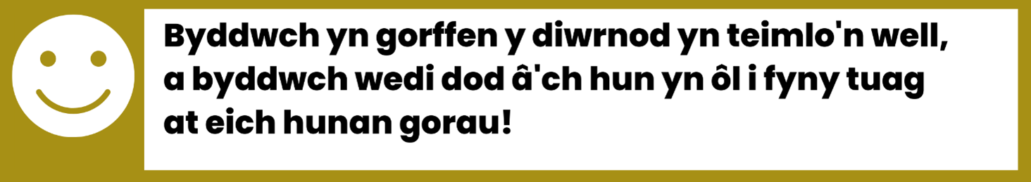 - Os ydych chi'n teimlo unrhyw beth yn llai na'ch hunan gorau, a ydych chi'n gallu meddwl am unrhyw beth a fydd yn eich helpu i symud tuag at eich hunan gorau?