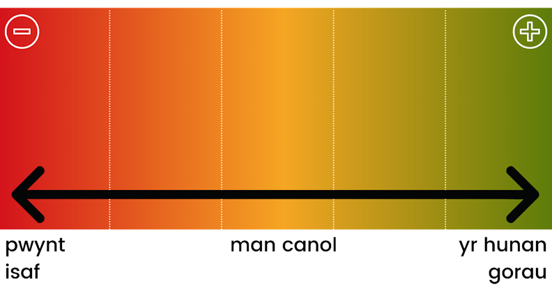 Y gobaith yw eich bod wedi bod yn gweithio ar eich graddfa hunan gorau, gan ddod i wybod sut y byddwch yn teimlo ar y gwahanol bwyntiau ar y raddfa.