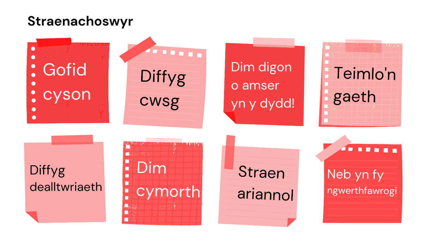 - Ystyried yr effaith y mae straen yn ei chael arnoch chi a'r bobl o'ch cwmpas