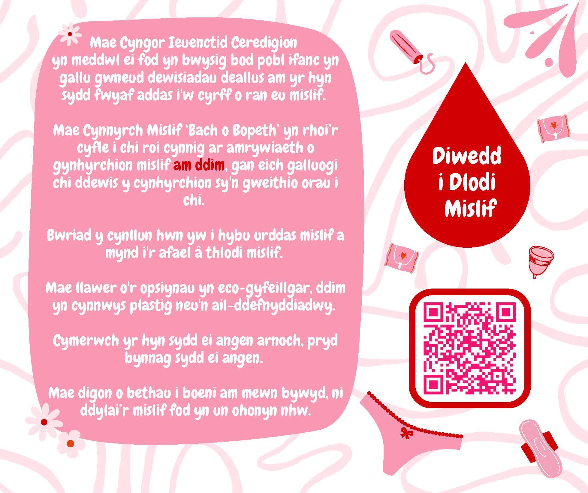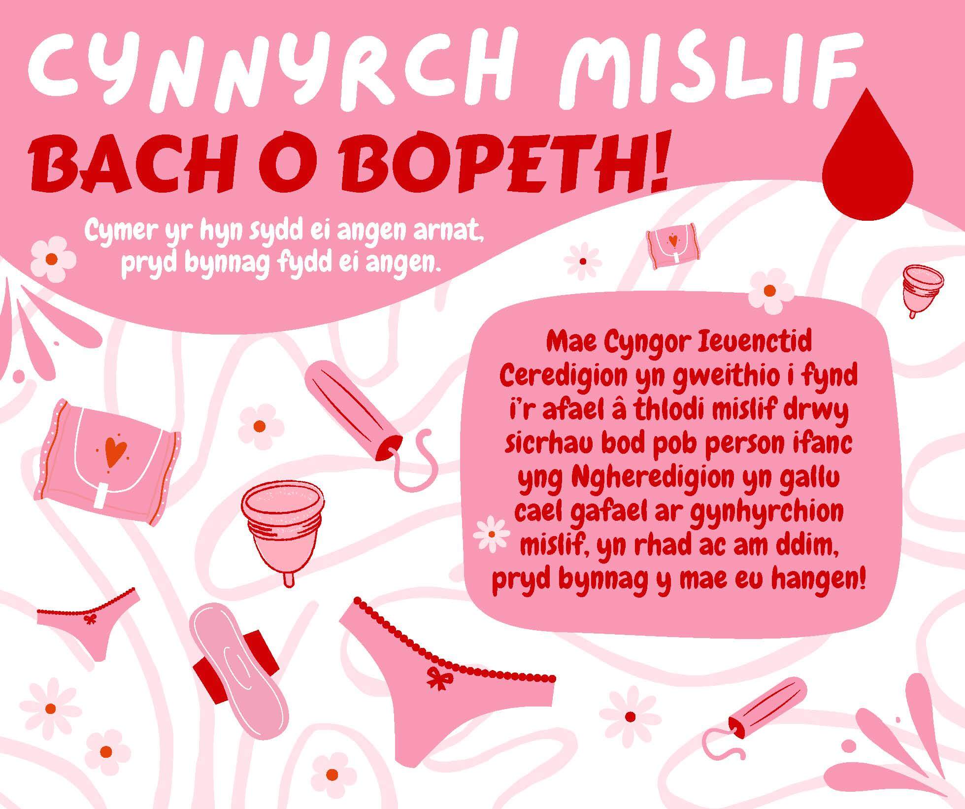 Mae Cyngor Ieuenctid Ceredigion o’r farn ei bod yn bwysig bod pobl ifanc yn gallu gwneud penderfyniad ar sail gwybodaeth ynghylch yr hyn sydd fwyaf addas ar gyfer eu cyrff o ran eu mislif. Mae gan bob Ysgol Uwchradd uned cynnyrch mislif ‘bach o bopeth’ sy’n rhoi’r cyfle i ddisgyblion roi cynnig ar amrywiaeth o gynhyrchion am ddim, gan ganiatáu iddynt ddewis y cynhyrchion sy’n gweithio orau iddyn nhw. Mae llawer o'r opsiynau yn ecogyfeillgar, heb blastig neu'n ailddefnyddiadwy. Cymrwch fag a dewiswch eich cynnyrch!
