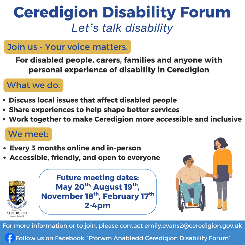 For more information or to join, please contact emily.evans2@ceredigion.gov.uk or follow ‘Forwm Anabledd Ceredigion Disability Forum’ on Facebook.