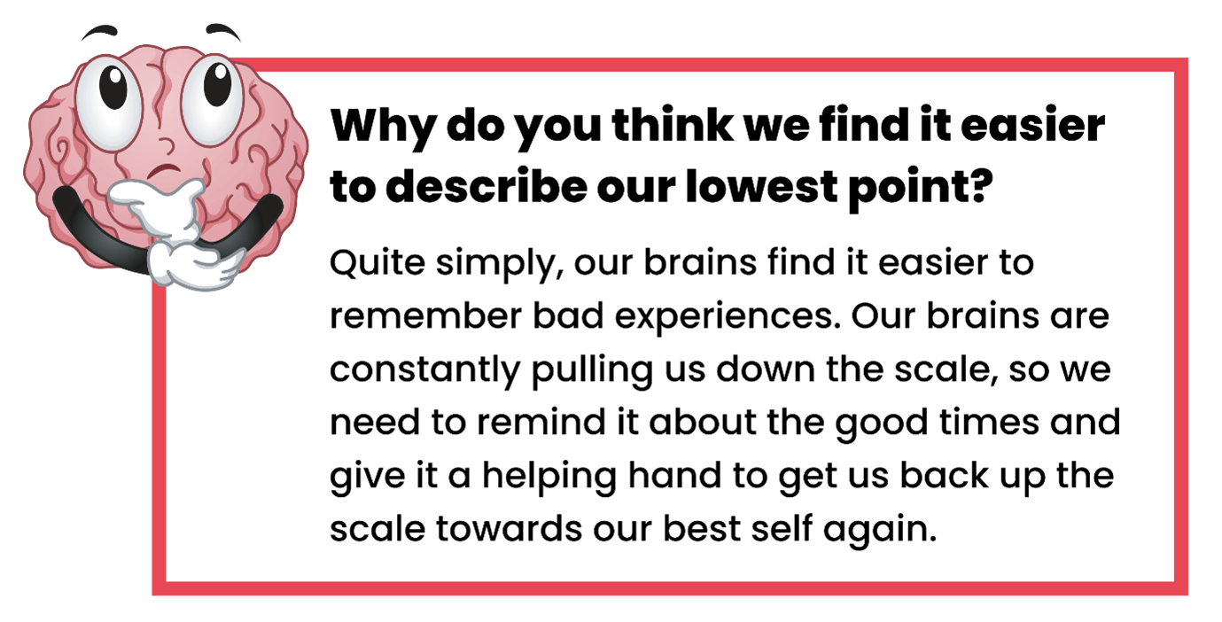 On the sliding scale, ‘best self’ is the best you can possibly be and ‘lowest point’ is the lowest you can be. Think about how you are feeling right now. Where are you on the scale?