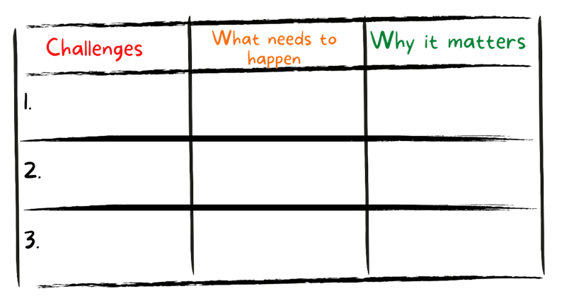 In the second column, under the heading What Needs to Happen, make note of what you think needs to happen for each challenge. Use what you have learned in the course to help you: