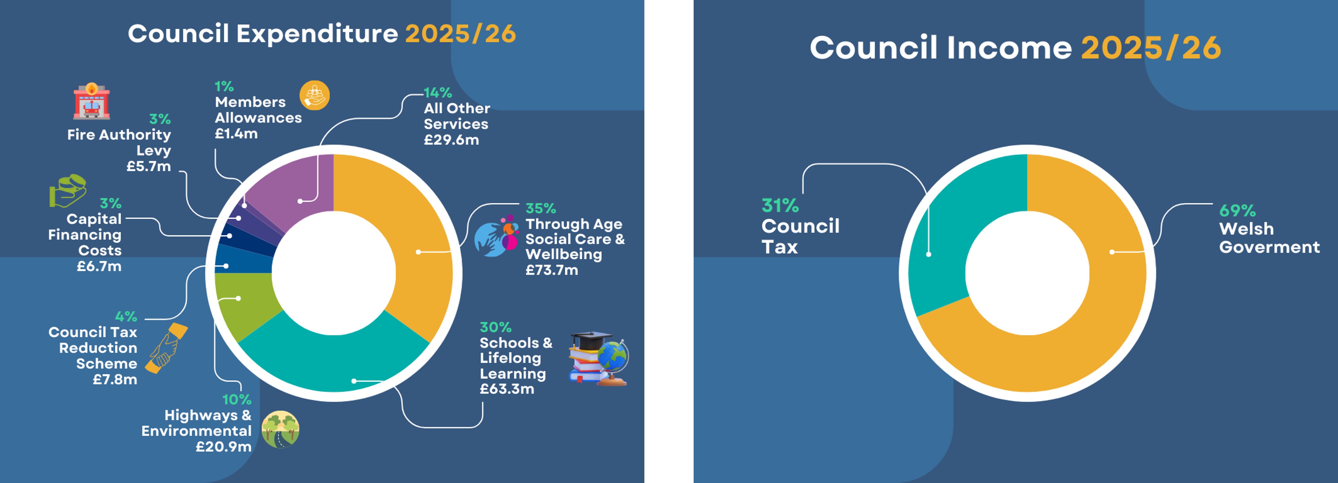 By law, councils must set a balanced budget – we can’t spend more than we have. Most of our funding comes from the Welsh Government, council tax, and income from fees and charges.